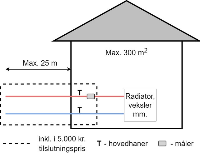 Ved et almindeligt enfamiliehus forstås et hus på max. 300 m² og med en stikledning på max. 25 meter målt fra skel ved vejen til husets sokkel der, hvor den nuværende varmekilde er placeret.